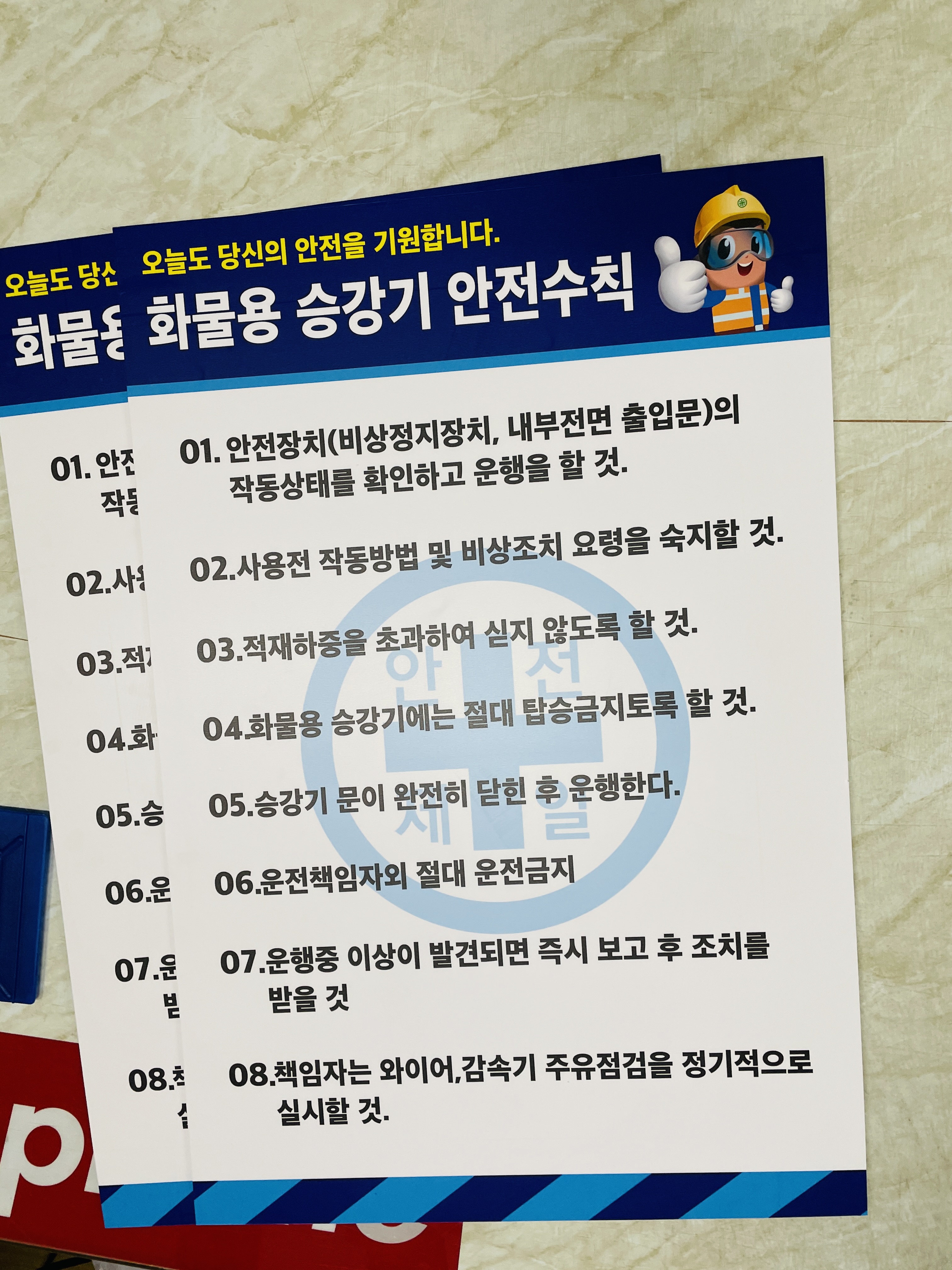 화물용 승강기 안전수칙 산업스티커 표지판 자석 표시 안전장치의 작동상태를 확인하고 운행을 할 것 적재하중을 초과하여 싣지 않도록 할 것 승강기 문이 완전히 닫힌 후 운행한다.