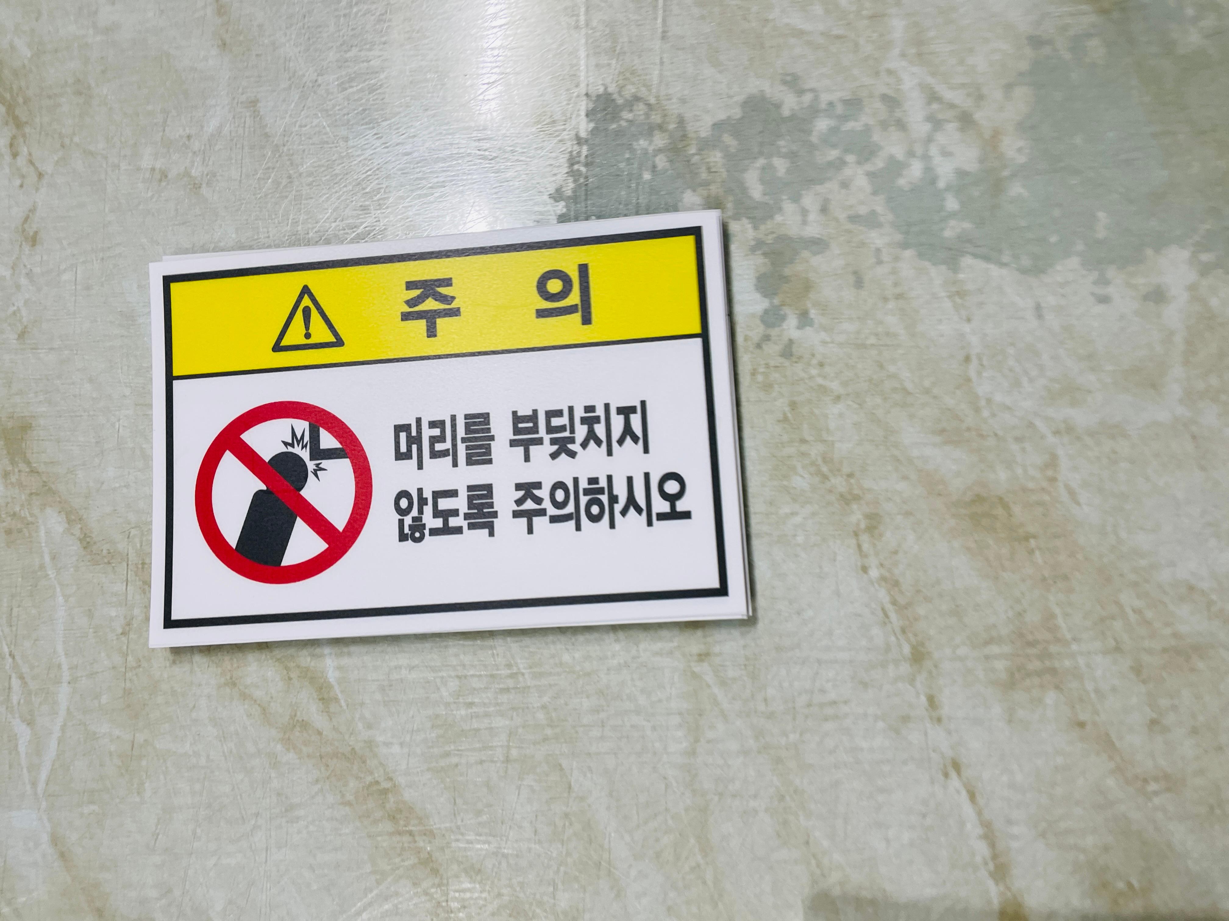 머리를 부딪치지 않도록 주의하시오 산업스티커 표지판 자석 이동중에 머리가 부딪칠 수 있어서 안전 표지를 부작하여 사고를 예방합니다.