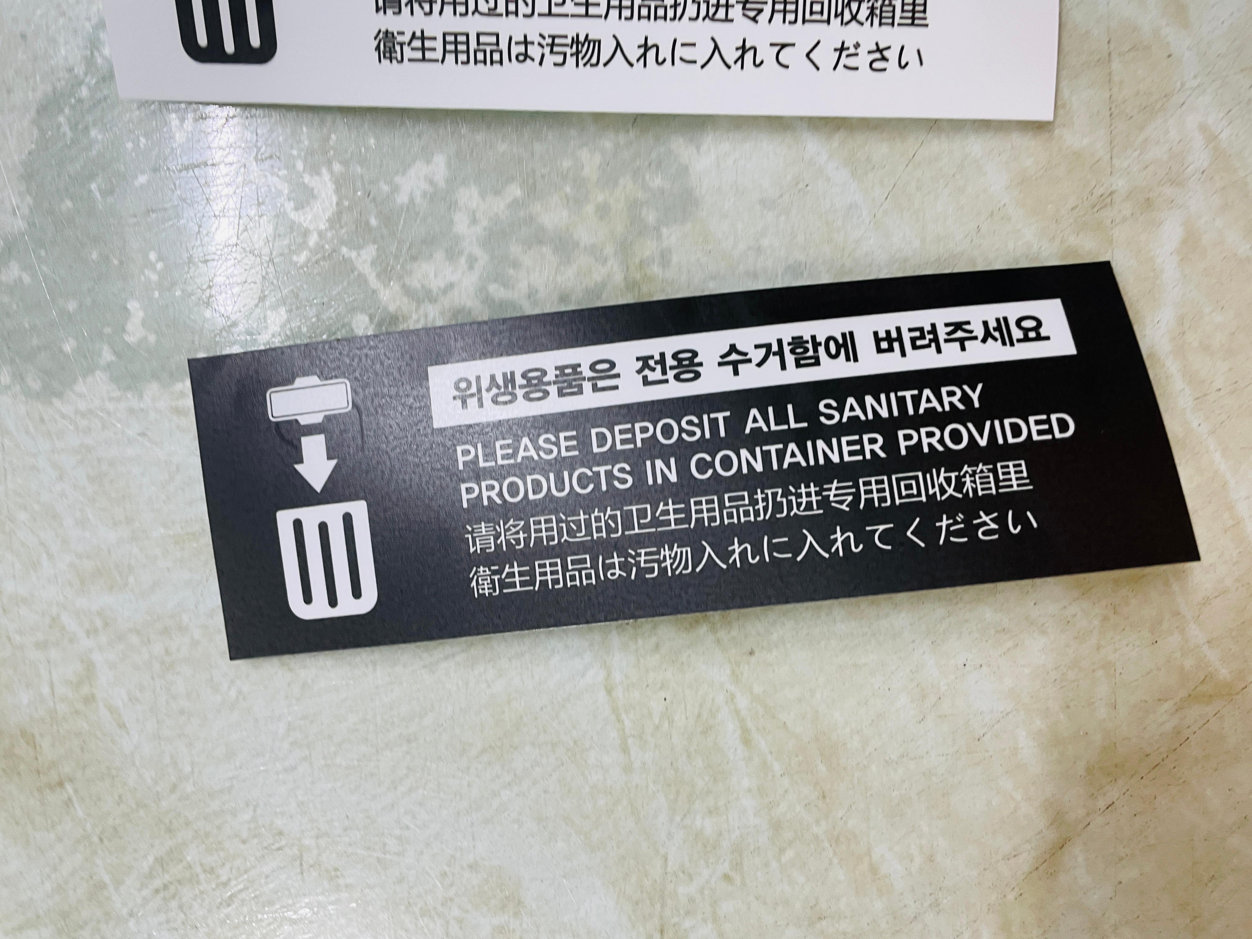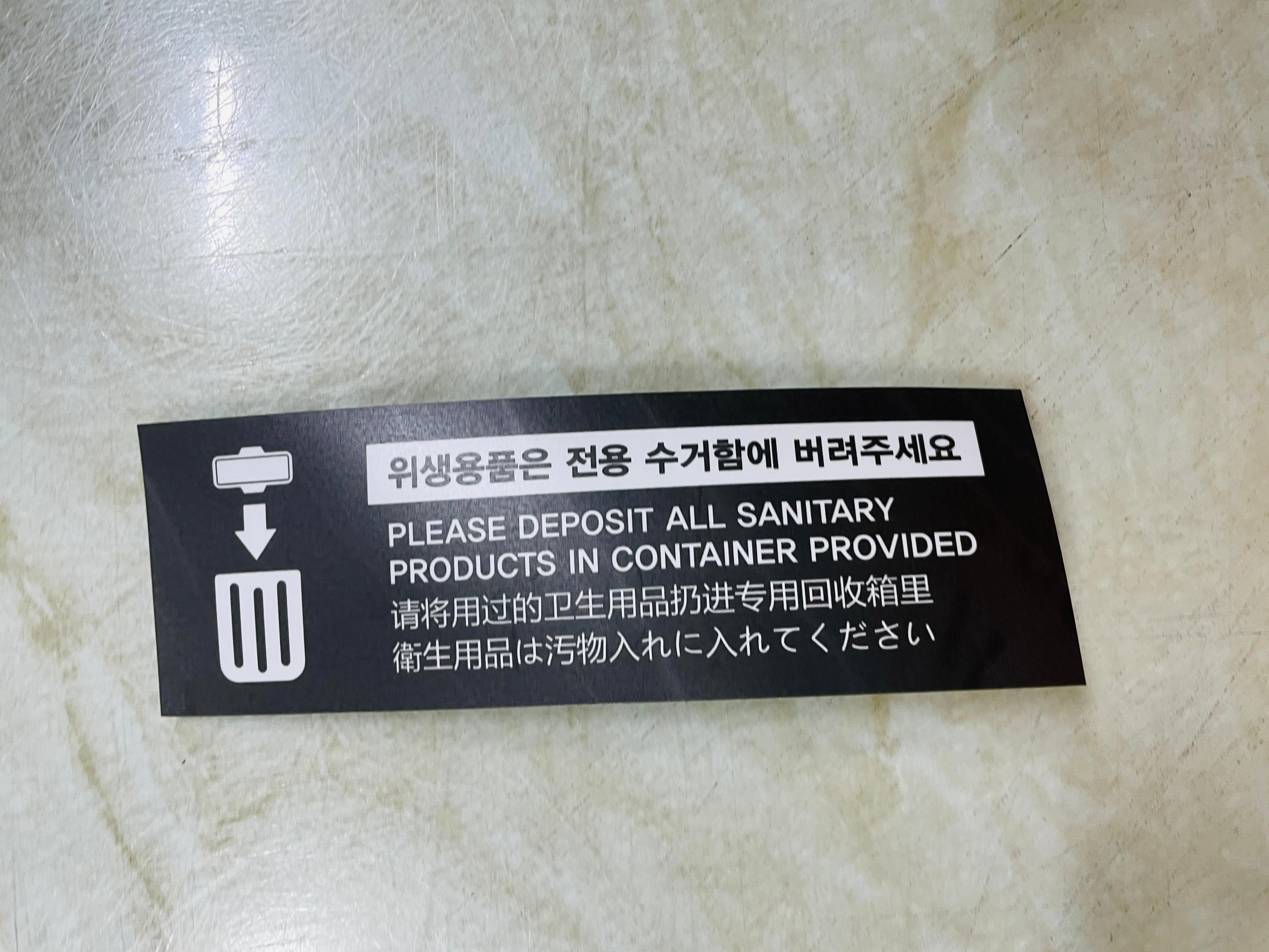 위생용품은 전용 수거함에 버려주세요 영어 중국어 일본어 검은색 스티커 표지판 자석 PLEASE DEPOSIT ALL SANITARY PRODUCTS IN CONTAINER PROVIDED 화장실의 변기에 위생용품을 넣어 변기가 막히고 배관에 문제가 생기는 것을 방지하고자 표지를 부착하여 문제를 예방합니다.