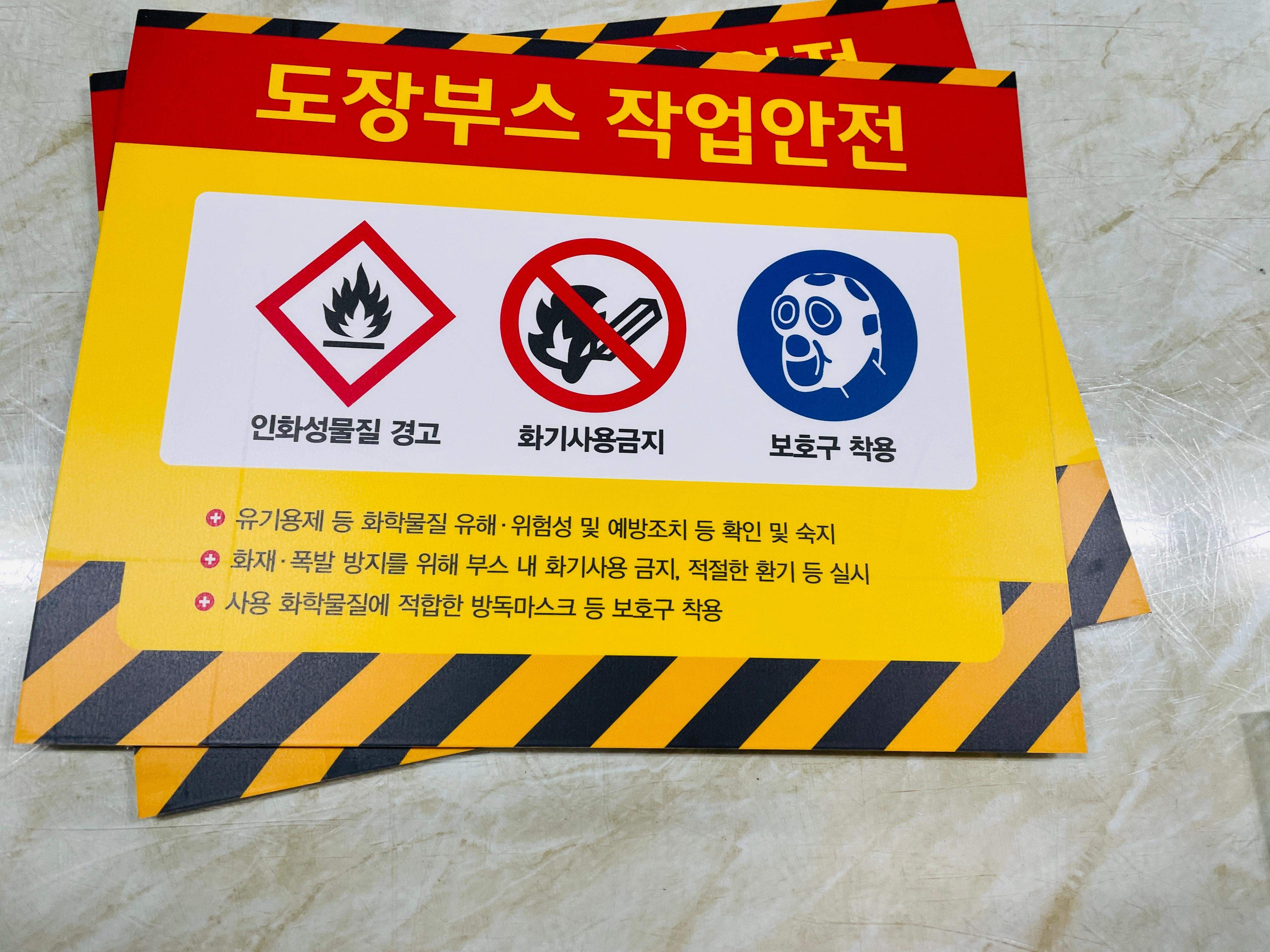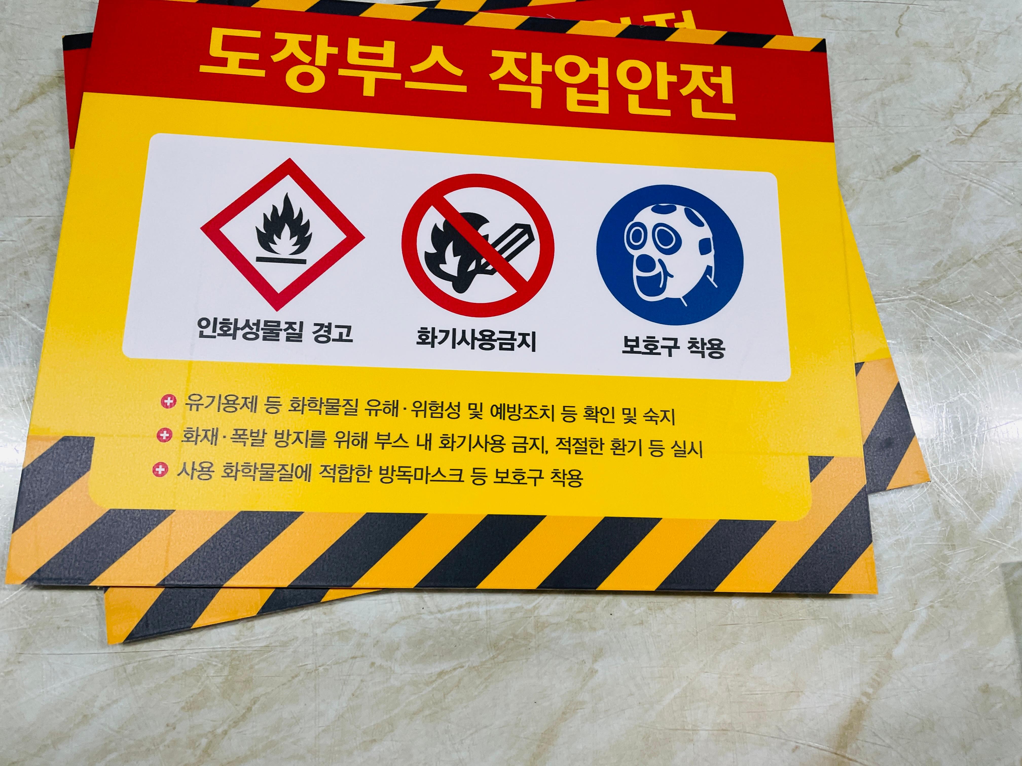 도장부스 작업안전 표지판 인화성물질 경고 화기사용금지 보호구 착용 유기용제 등 화학물질 유해 위험성 및 예방조치 등 확인 및 숙지 화재 폴발 방지를 위해 부스 내 화기사용 금지 적절한 환기 등 실시 사용 화학물질에 적합한 방독마스크 등 보호구 착용 기본적인 도장부스의 작업안전 내용이 있는 표지를 명시해 안전사고를 예방합니다.
