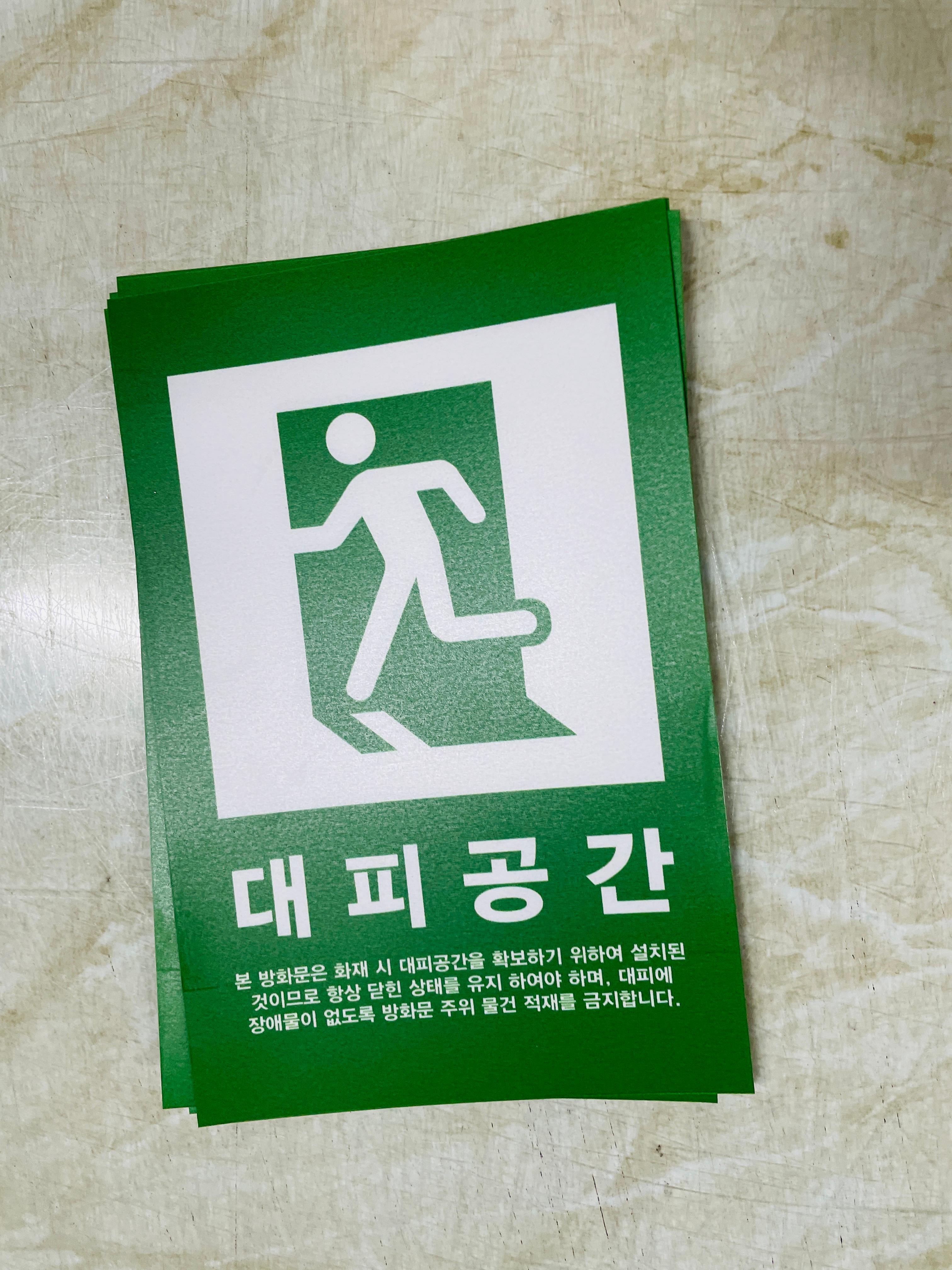 대피공간 본 방화문은 화재 시 대피공간을 확보하기 위하여 설치된 것이므로 항상 닫힌 상태를 유지 하여야 하며, 대피에 장애물이 없도록 방화문 주위 물건 적재를 금지합니다. 산업스티커 표지판 자석 표시 녹색 초록색 화재 등 재해 상황에서 대피공간의 위치에 표지를 부착하여 대피할 수 있도록 합니다.