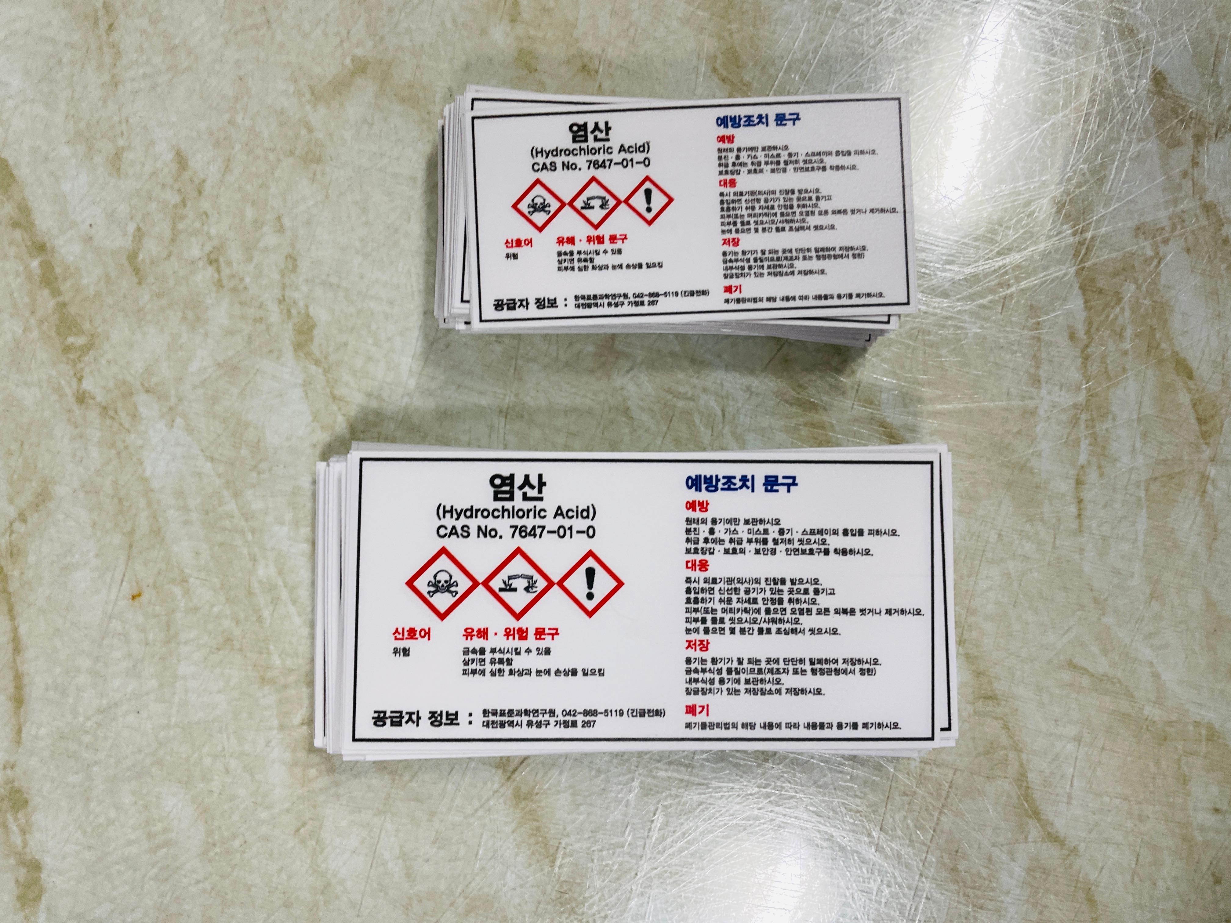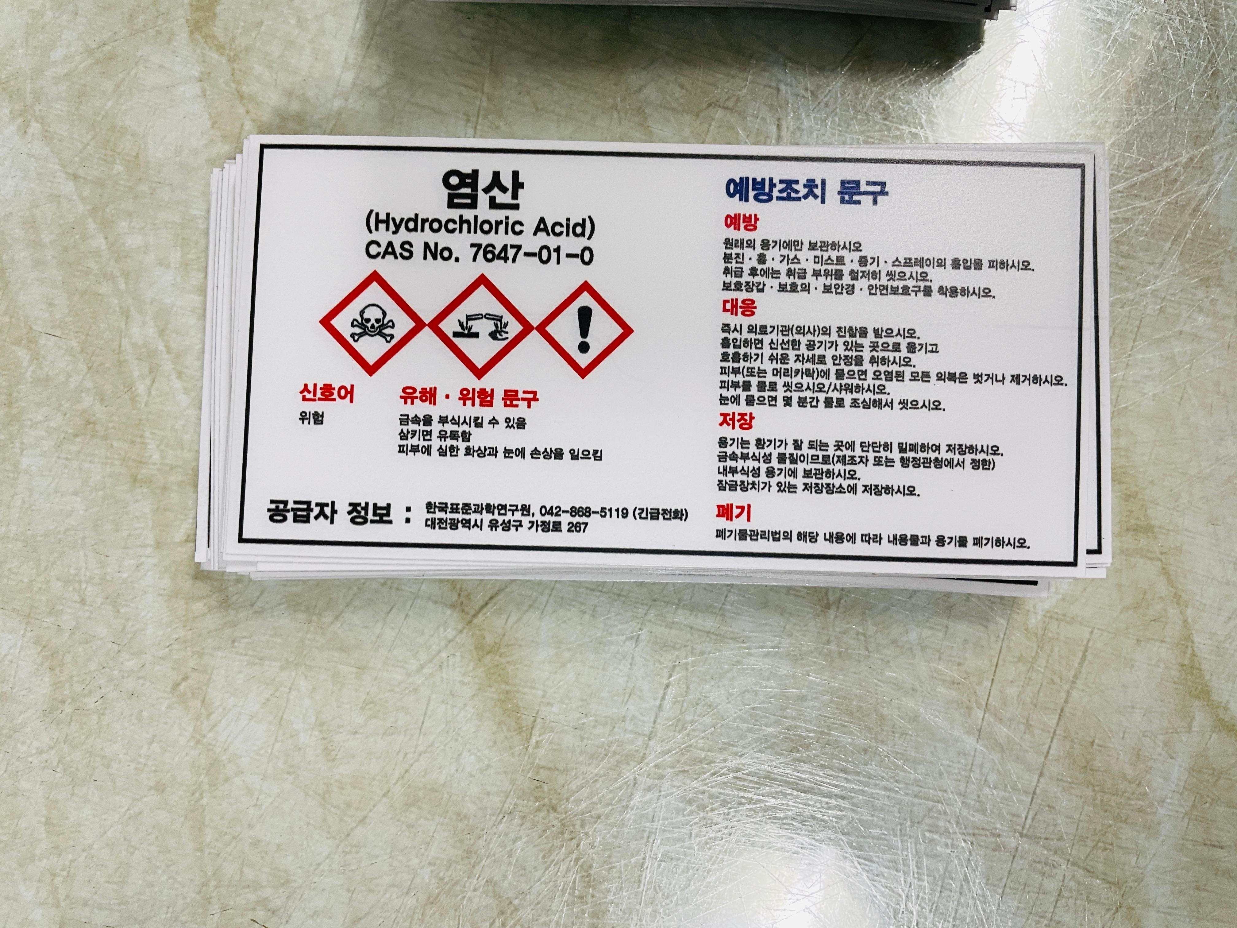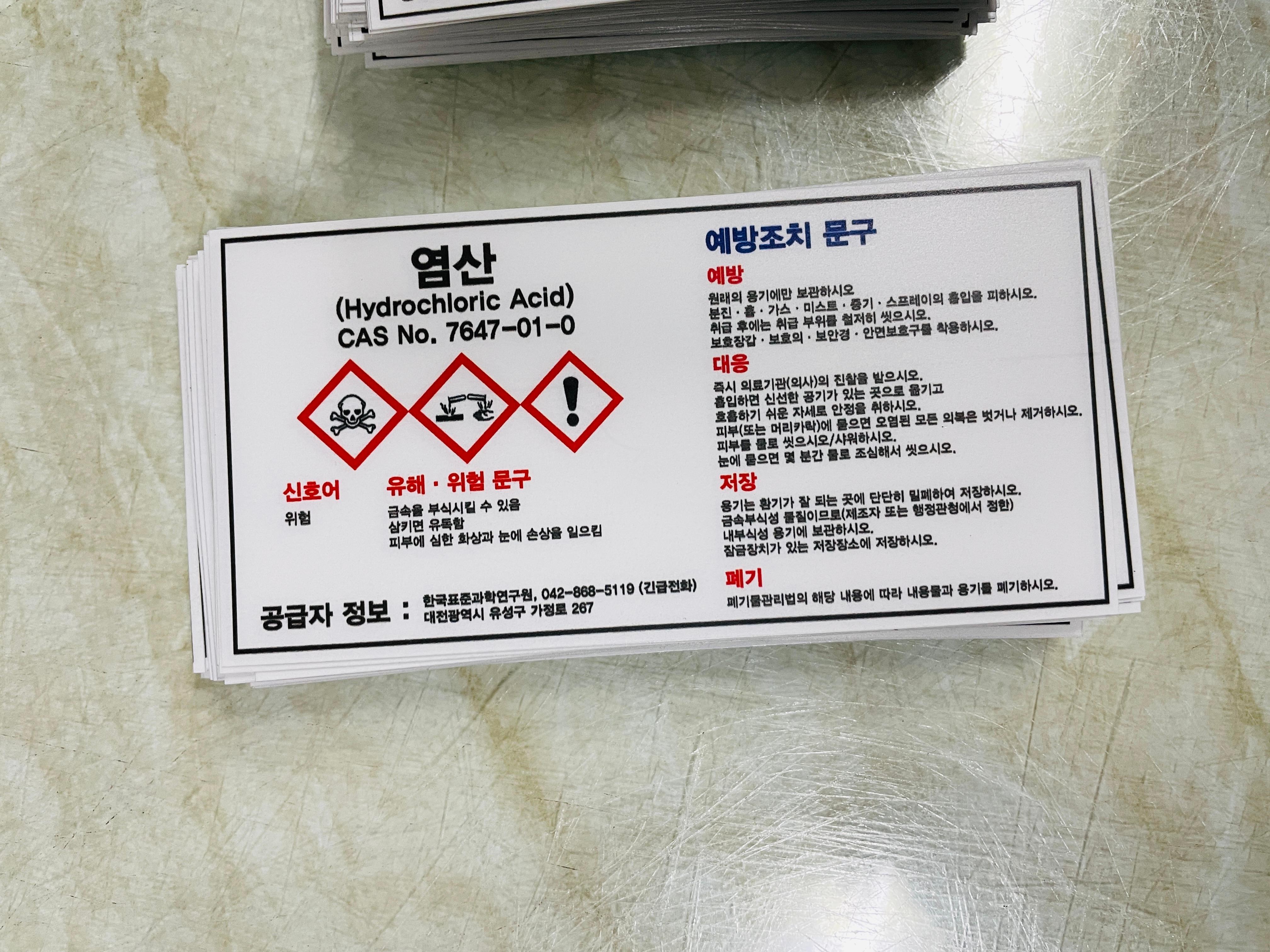 염산 CAS NO 7647-01-0 산업스티커 표지판 자석 MSDS 물질안전보건자료 소량 소분 용기 유해화학물질 안전한 화학물질을 사용하기 위해 물질의 기본적인 정보를 부착하여 안전사고를 예방합니다.