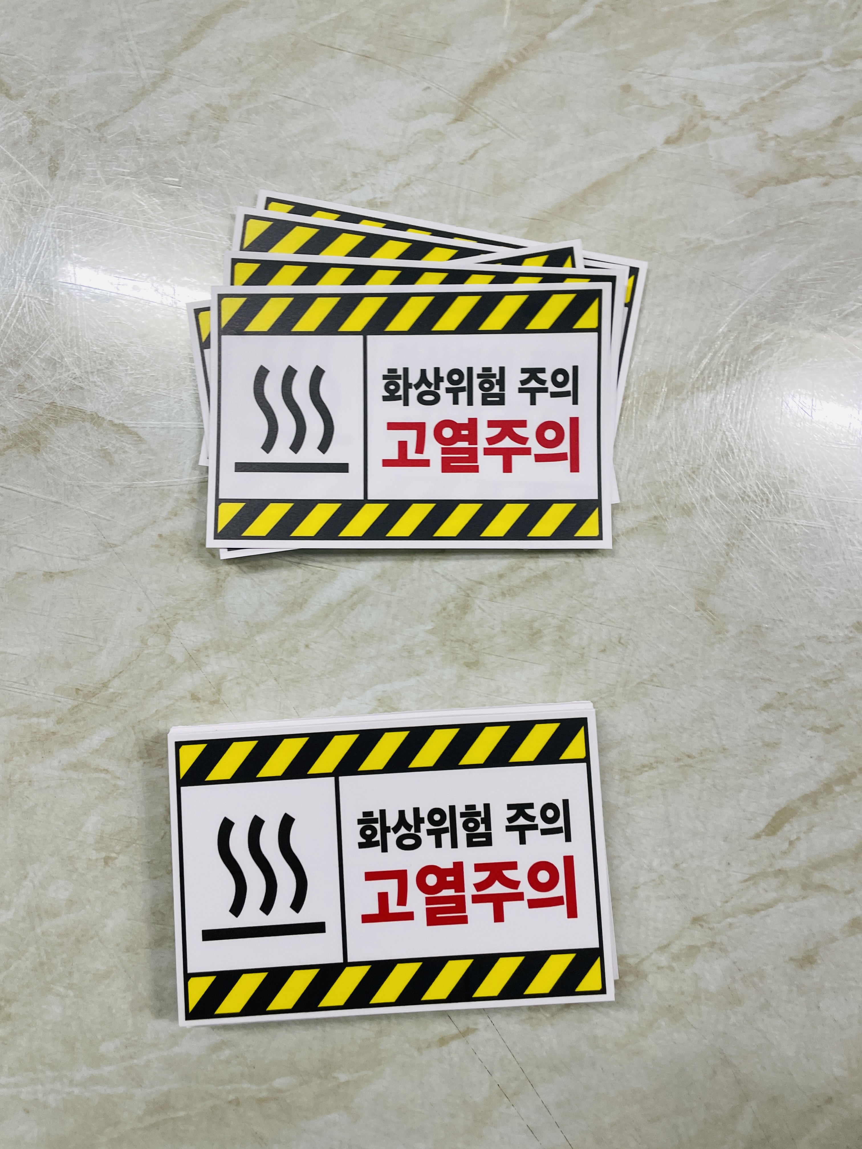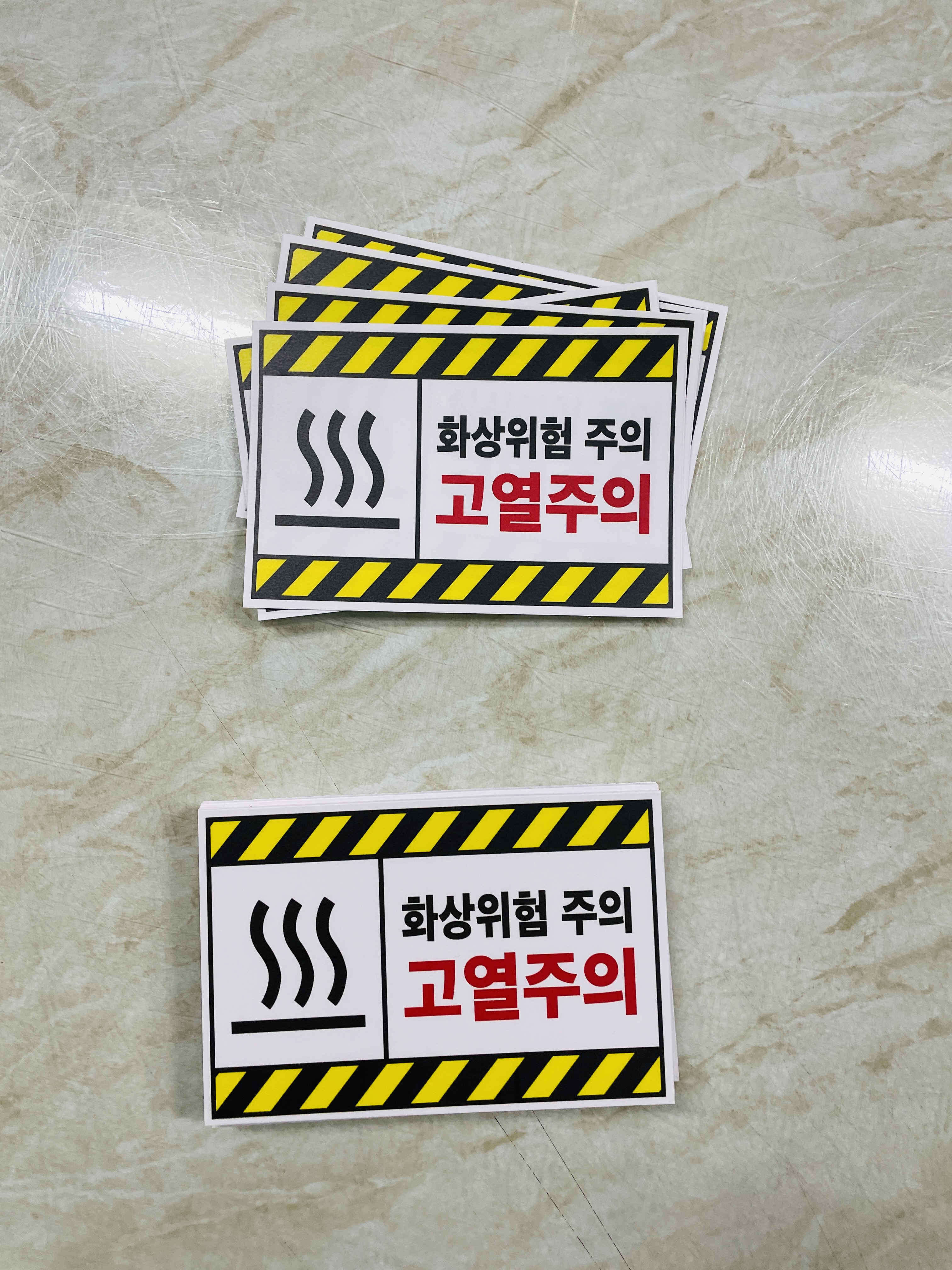 화상위험 주의 고열주의 산업스티커 표지판 자석 표시 고열로 인하여 화상위험이나 피부나 얼굴에 화상위험이 있어 안전보호구 착용 및 안전표지를 부착하여 사고를 예방합니다.
