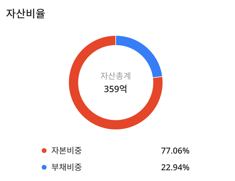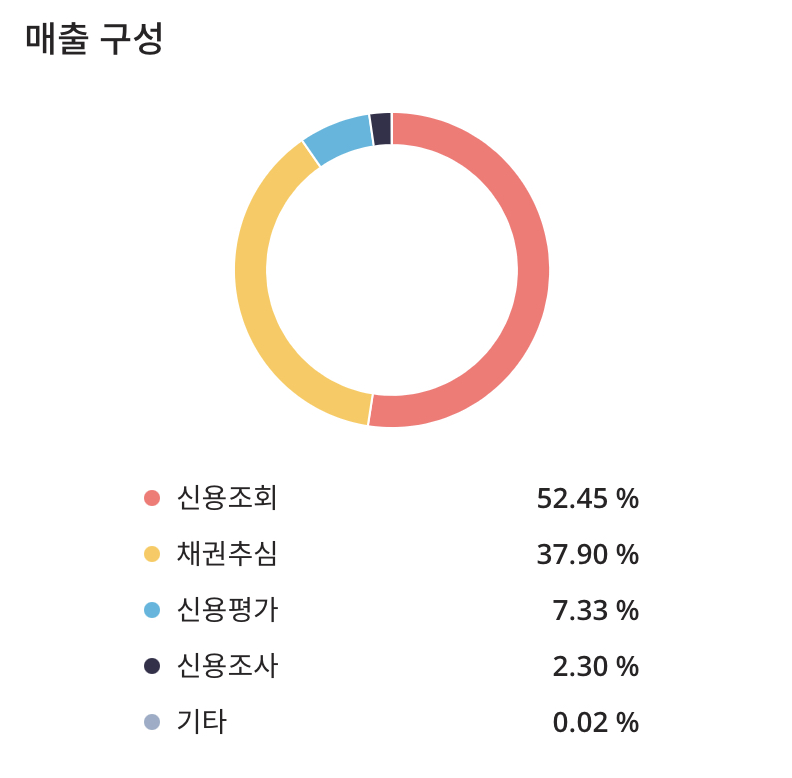 SCI평가정보(036120)의 자산비율은 자본비중 77.06%, 부채비중 22.94%로 구성되어 있으며 매출 구성은 신용조회 52.45%, 채권추심 37.90%, 신용평가 7.33%, 신용조사 2.30%, 기타 0.02%로 구성되어 있습니다.