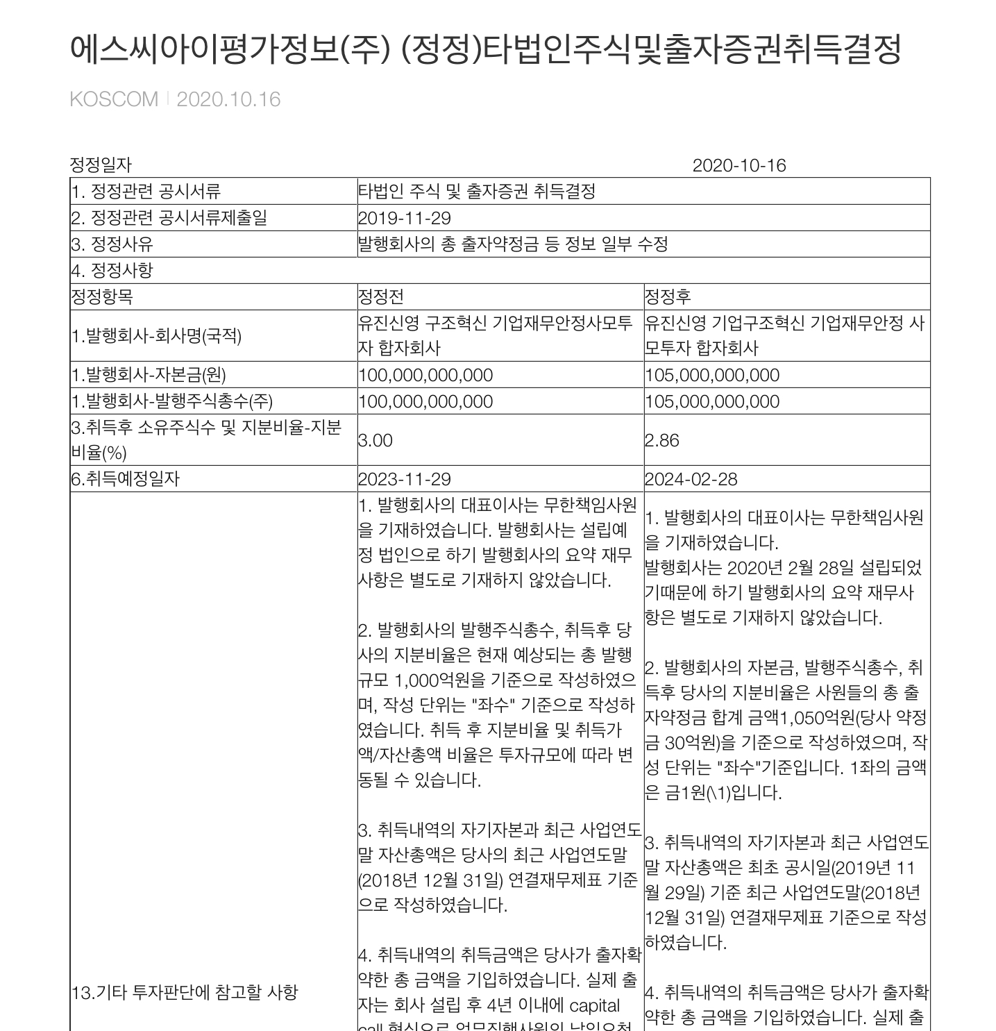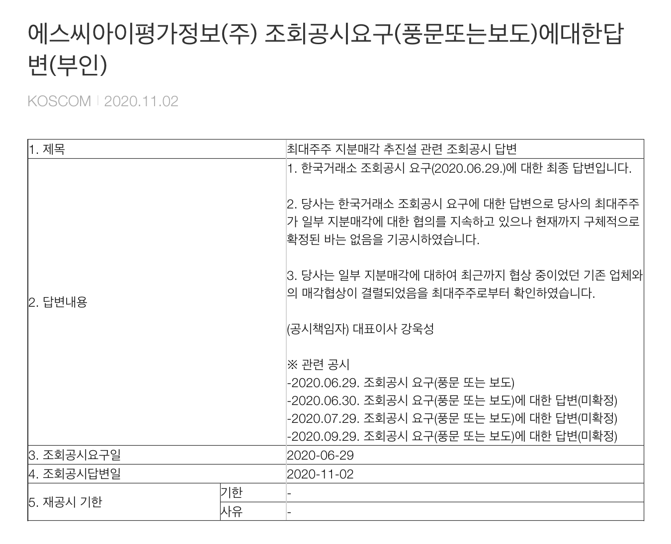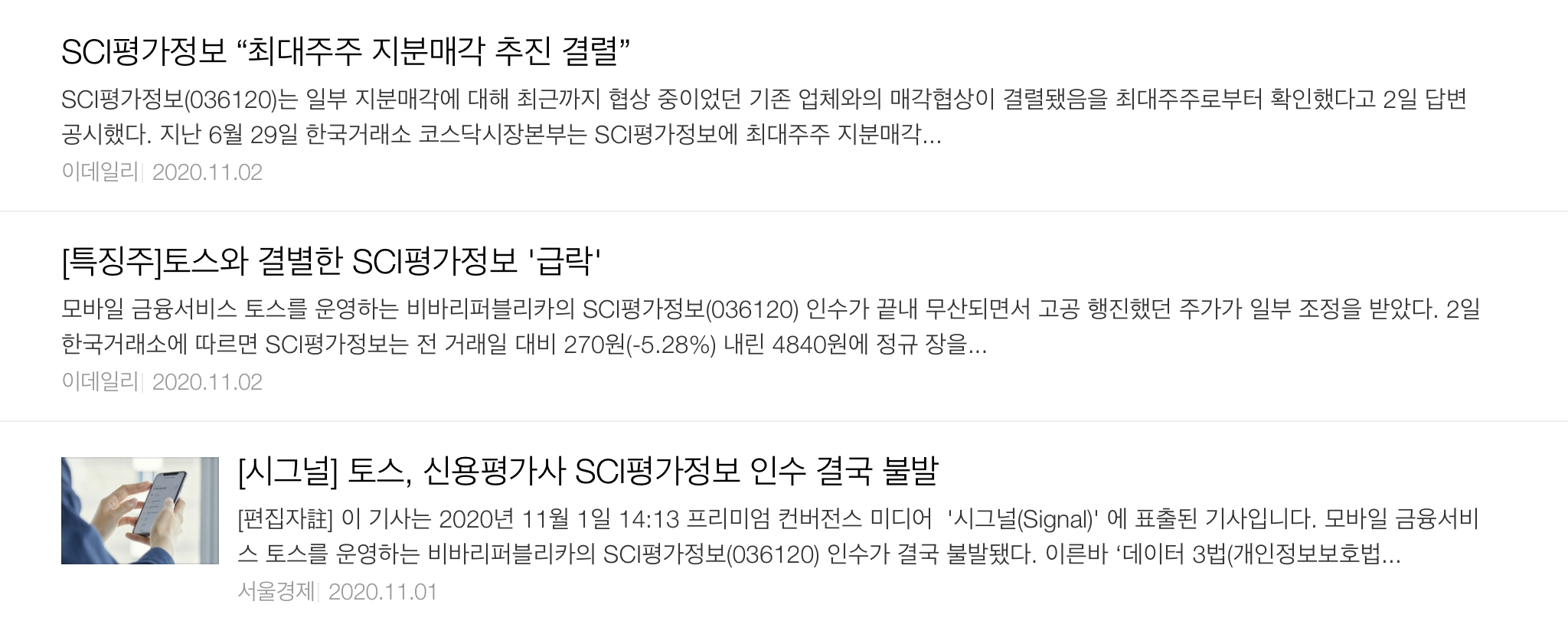SCI평가정보(036120)의 최근 뉴스로는 토스 인수 결국 불발과 최대주주 지분매각 추진 결렬 되었다는 뉴스를 확인 할 수 있고 공시 내용도 있습니다.