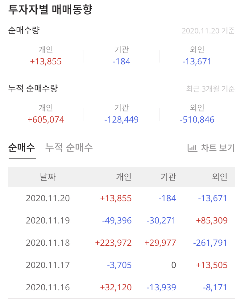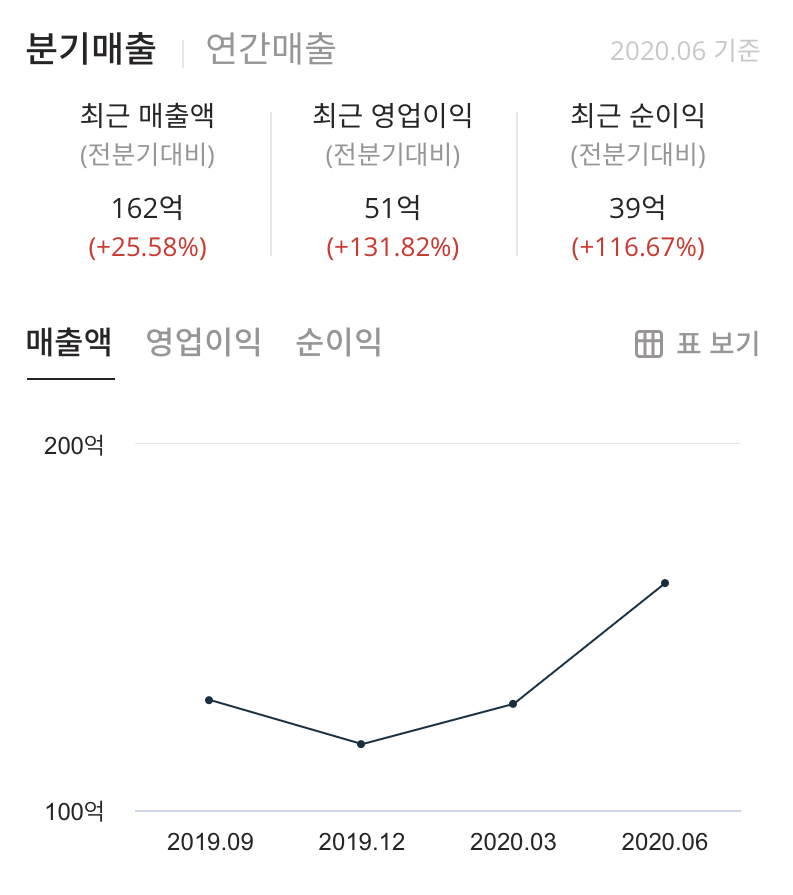 2020년 6월기준 매출액과 영업이익 그리고 순이익이 증가하고 있으며 투자자별 매매동향은 개인이 매수이며 외국인과 기관은 매도를 하고 있습니다.