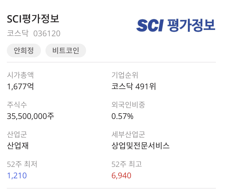 SCI평가정보(036120)는 코스닥 기업으로 2017년 안희정 테마주 (동문설) 그리고 비트코인 관련은 에스코인은 SCI평가정보에서 지분이 있었지만 올해 4월에 전부 처분을 했습니다. 그리하여 안희정과 비트코인 테마주는 해당이 없다고 생각됩니다.
