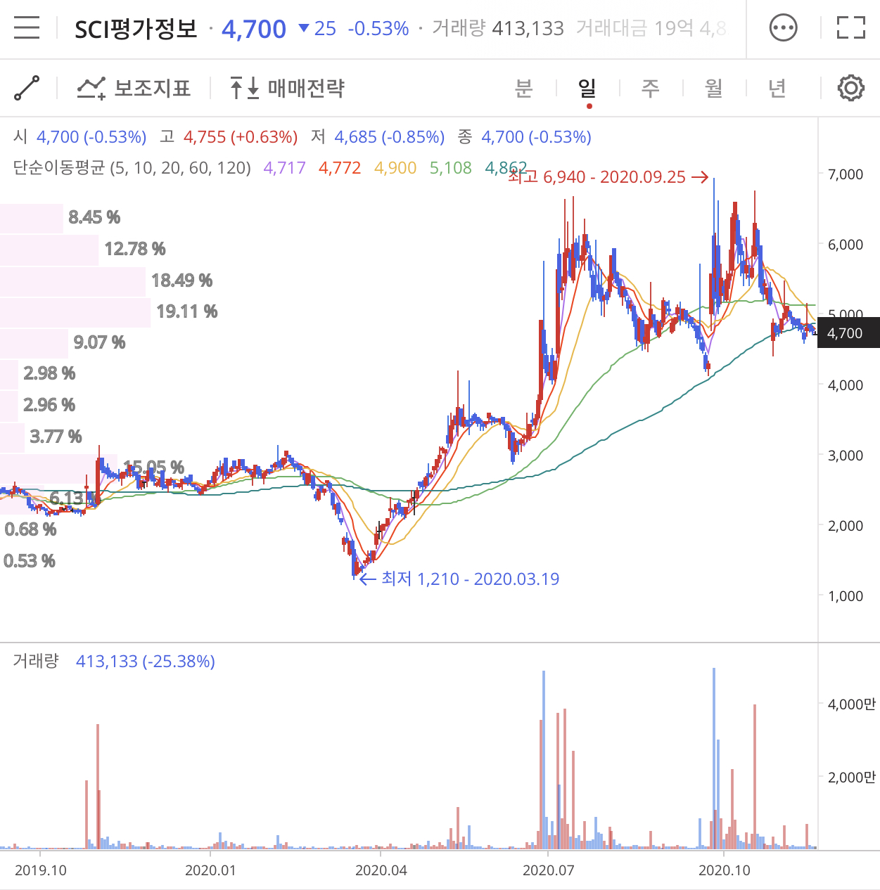 오늘은 SCI평가정보(036120) 종목분석 그리고 관련 뉴스 기본정보를 알아보는 시간입니다. 2020년 11월 23일 0.53% 내린 4,700원에 정규장이 마감했습니다. COVID-19 저점 1210원을 찍고 상승 했는데요 기본 정보부터 확인해 보겠습니다.