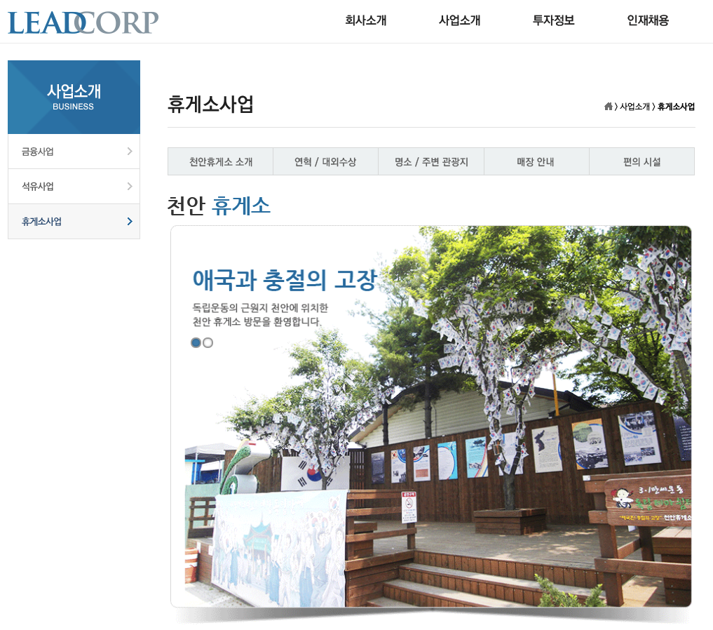 리드코프 휴게소사업은 천안휴게소가 있으며 처음시작은 1995년 천안(하)휴게소 임대차 계약(경부고속도로)으로 시작되었습니다.