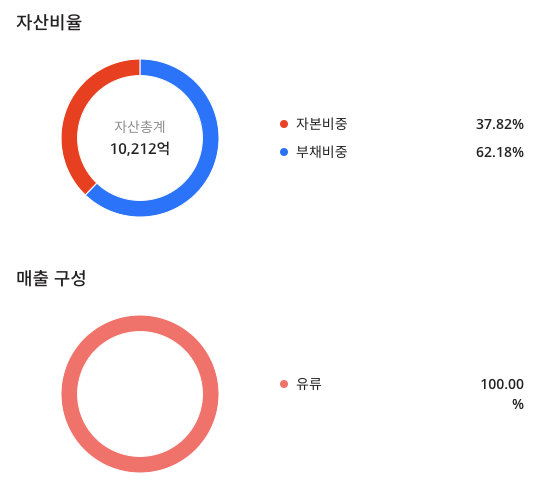 리드코프(012700)의 자신 비율은 자본비중 37.82%, 부채비중 62.18% 이며 자산 총계는 1조 212억인듯 합니다. 매출구성은 유류라고 되어 있으며 주요사업의 석유사업이 있어서 유류 사업의 구성이 되어있는듯 합니다.