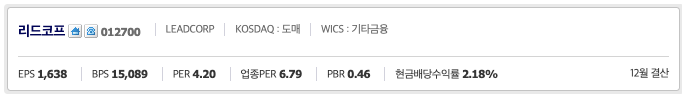 이번 시간은 리드코프(012700)에 대해서 알아보려고 합니다. 리드코프의 기본정보를 먼저 확인해 보겠습니다.