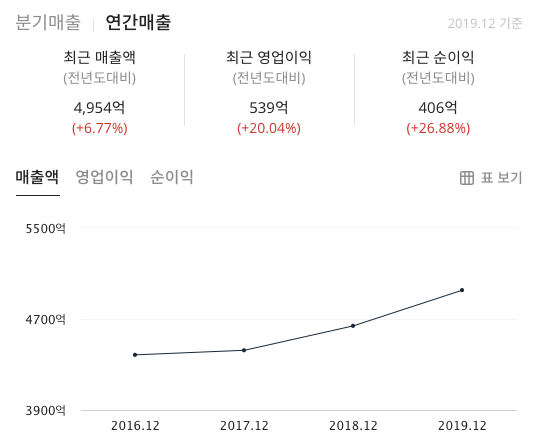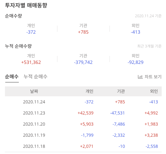 연간매출은 성장을 하고 있으며 최근 누적 순매수랑은 개인 매수포지션 이며 기관 외인은 매도 포지션입니다.