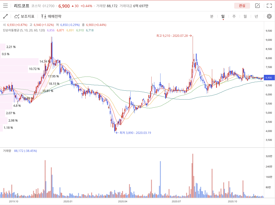 리드코프(012700)는 코스닥에 상장되어 있으며 COVID-19 저점 2020년 3월 19일 3,890원 저점을 찍고 2020년 7월 28일 고점 9,210원 찍고 2020년 11월 24일 6,900원에 정규장이 끝났습니다.