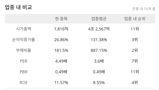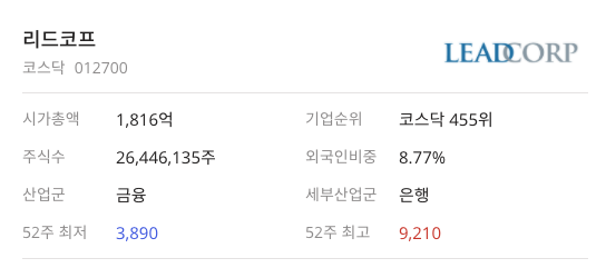리드코프(012700)는 코스닥에 상장되어 있으며 기업순위 코스닥 455위, 산업군 금융, 세부산업군 은행이며 은행 내 16개중 시가총액 11위(1,816억)이며 ROE 는 11.57%로 4위 업종편균은 8.55% 라고 합니다. WICS 분류로는 기타금융으로 되어 있습니다.