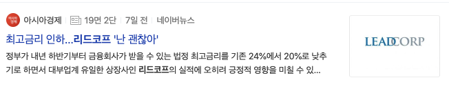 최고금리 인하 리드코프 난 괜찮아라는 기사제목을 볼 수 있습니다. 정부가 내년 하반기부터 금융회사가 받을 수 있는 법정 최고금리 를 20%로 낮추기로 하였고 상장사인 리드코프관련 기사제목과 나용입니다.