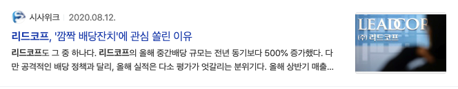 참고로 리드코프 2020년 중간배당은 주당 300원을 배당했습니다.