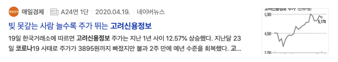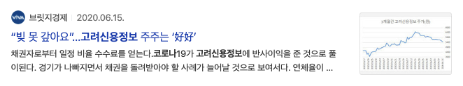 2020년 6월 빚 못 갚아요 고려신용정보 주주 호호 라는 기사제목이 보입니다. 이 기사제목은 매일경제 4월 뉴스 제목과 비슷합니다.