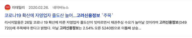 2020년 2월 코로나19 확산에 자영업자 줄도산 늘어 고려신용정보 주목이라는 뉴스 제목이 보입니다.