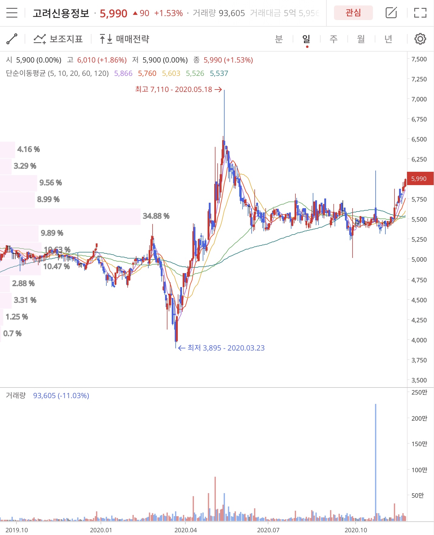 고려신용정보(049720)는 2020년 3월 23일 COVID-19 저점 3,895원 저점을 찍고 2020년 5월 18일 고점 7,110을 찍고 2020년 11월 26일 5,990원으로 장을 마감했습니다.