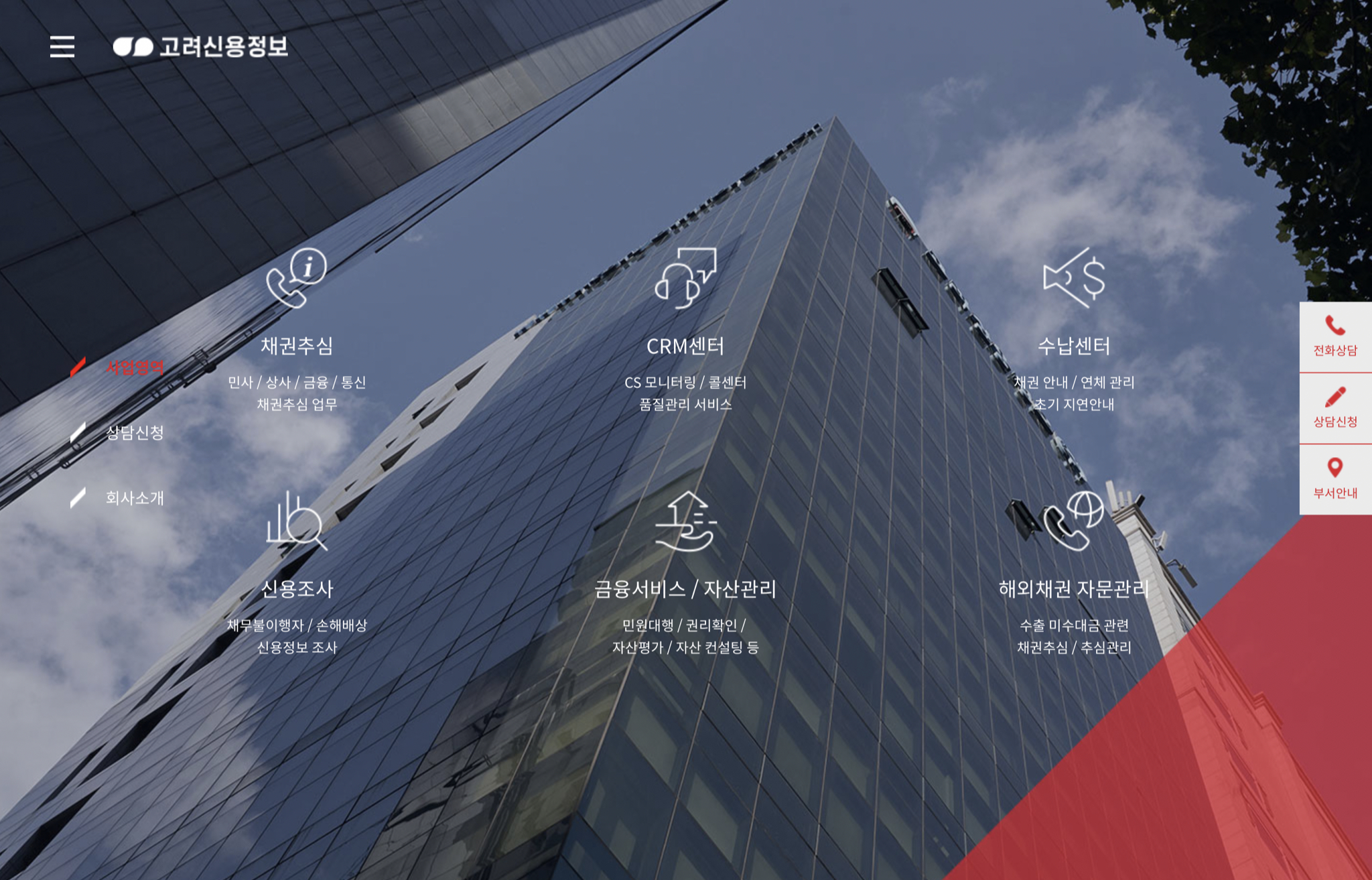 고려신용정보(049720)는 채권추심업, 신용조사업, 민원대행업을 영위하고 있으며, 업계 Leading Company로서 신용정보협회 기준 국내 채권추심 업계 1위를 유지하고 있습니다.