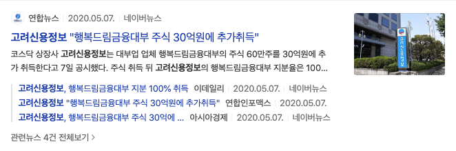 2020년 5월 고려신용정보 행복드림금융대부 주식 30억원에 추가 취득 지분율 100%라는 기사제목을 볼 수 있습니다.