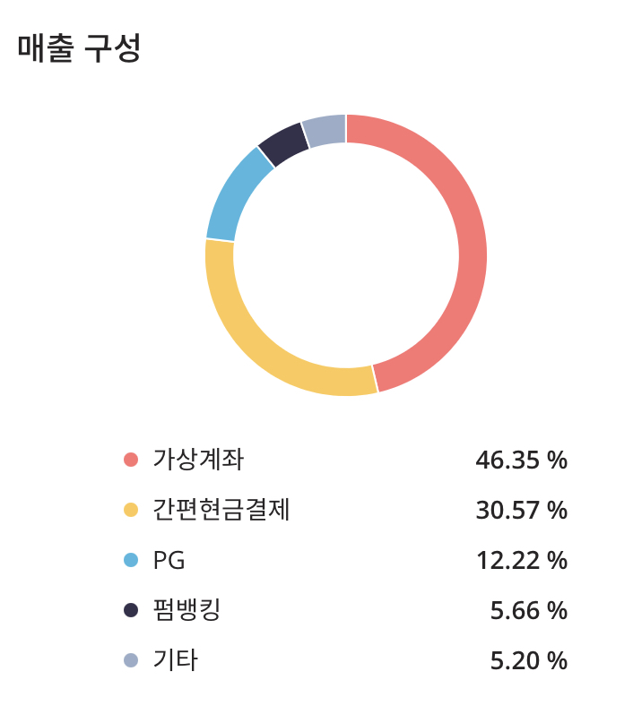 매출구성은 가상계좌 : 46.35%, 간편현금결재 : 30.57%, PG : 12.22%, 펌뱅킹 : 5.66%, 기타 : 5.20%로 구성되고 있습니다.