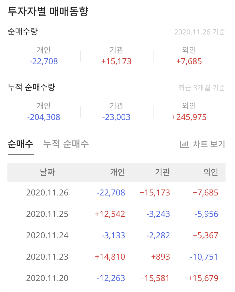 최근 3개월 기준 투자자별 매매동향은 외인이 매수를 했고 개인과 기관은 매도를 했습니다.