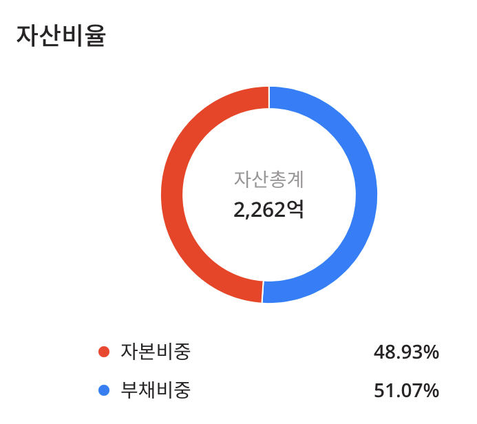 자산비율은 자본비중 : 48.93%, 부채비중 : 51.076% 입니다.