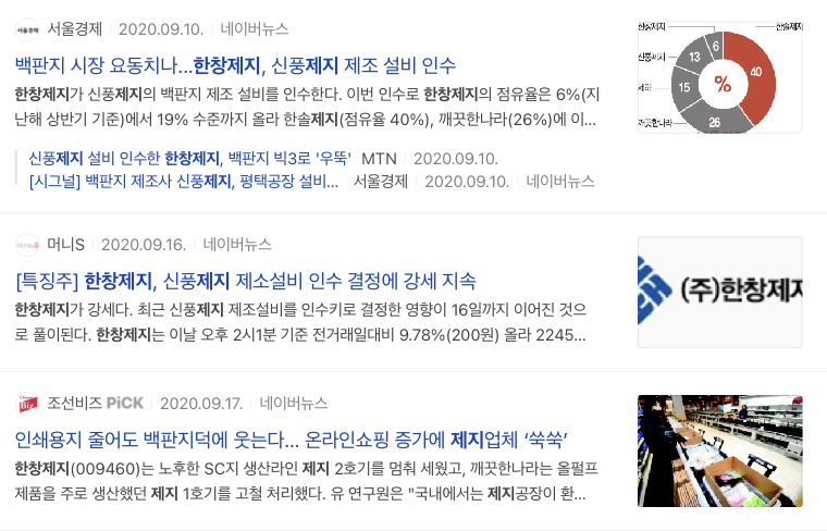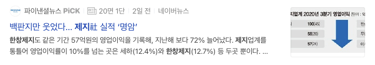 2020년 11월 백판지만 웃었다 라는 기사제목이 보입니다. 간단하게 정리하면 음식과 제약, 화장품등 고급 포장재로 쓰이는 백판지 업체들 실적개선과 9월에 인수한 신풍제지 설비를 바탕으로 780억 투자하며 중국의 폐지수입 규제 완화는 변수로 남아있다고 합니다.