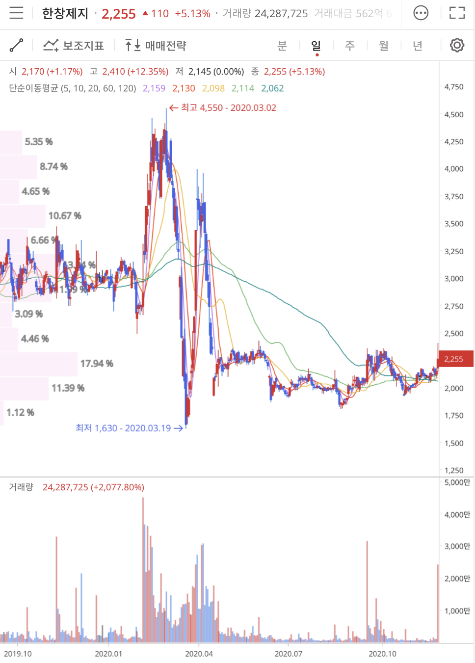 한창제지(009460)는 2020년 3월 2일 고점 4,550원을 찍고 2020년 3월 19일 COVID-19 저점 1,630원을 찍고 아직 3,000원선을 회복을 못하고 있습니다.