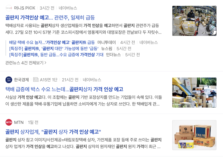 마지막으로 골판지 가격인상 예고로 관련주 일제히 급등이라는 기사를 준비했습니다.