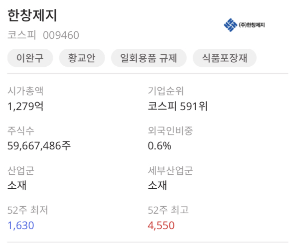 한창제지(009460)의 관련 테마는 이완구, 황교안, 일회용품 규제, 식품포장재에 속해 있는데 아래에서 알아보겠습니다.