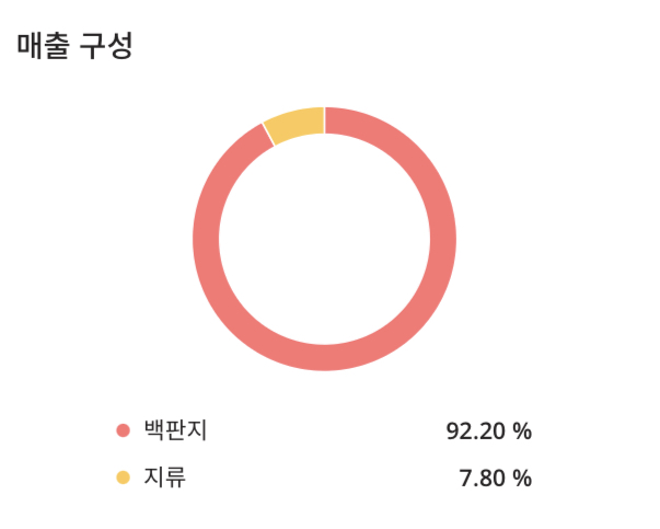 한창제지(009460)의 매출 구성은 백판지 92.20%, 지류 7.80% 로 구성되어 있습니다.
