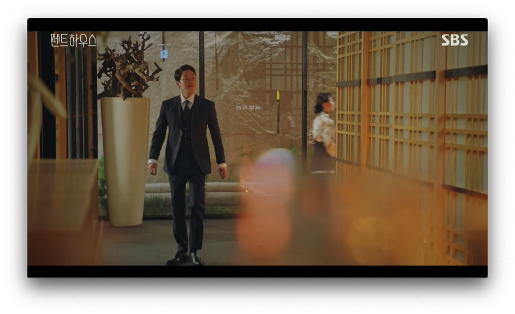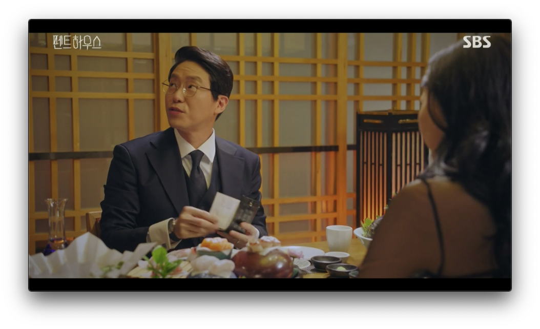 천서진이 있는 룸에 먼저 들어간 주단태 그리고 그 다음 하윤철은 문을 살짝 열어서 확인을 합니다. 웃고 있는 아내(천서진)을 보고 분노하는 하윤철은 같이 있는 사람이 누구인지 확인을 하려고 하는데 식당 직원 때문에 결국 같이 있는 사람을 확인을 못합니다. 천서진은 주단태에게 신호를 주고 주단태는 식당 직원에게 돈을 주면서 조용히 먹고 싶으니깐 부르기전까지 들어오지말라고 합니다.