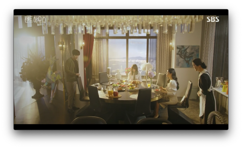 다음날 아침식사를 하기 위해 모인 하윤철 가족입니다. 천서진은 하윤철에게 술좀 깼냐고 어제는 누구랑 그렇게 많이 마신거냐고 물어봅니다. 하윤철은 주단태와 이규진하고 같이 마셨다고 합니다. 어제 주단태는 천서진하고 같이 있었기 때문에 천서진은 거짓말을 하고 있는것을 알고 더이상 묻지 않고 적당히 마시라고 말합니다.