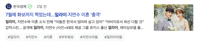 그리고 1년뒤에 7월에 화보까지 찍었는데 일라이 지연수 이혼 충격이라는 기사 제목을 볼 수 있습니다.