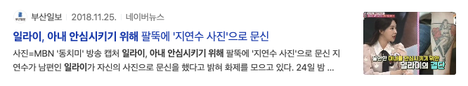 2018년도 11월 일라이 아내 안심시키기 위해 팔뚝에 지연수 사진으로 문신했다는 기사제목을 볼 수 있습니다.