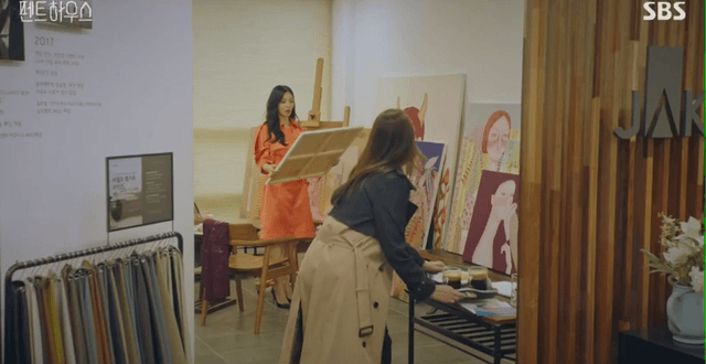 딸(민설아) 일기를 보면서 슬퍼하고 있는 심수련 앞에 천서진이 등장합니다. 천서진은 에그타르트를 가져왔고 심수련은 커피랑 같이 먹자면서 커피를 타러 간 사이에 한쪽 공간에 있는 그림들을 보는데 어떤 한그림을 들면서 애플목걸이를 보고 낯이 있다라고 생각을 합니다. 심수련은 지금 뭐하냐고 말하면서 아직 보여주기 부끄럽다고 말하면서 못보게 합니다.