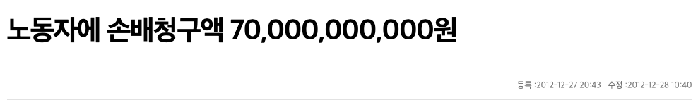 마지막으로 노동자에 손배청구애 700억 이라는 기사제목과 내용을 준비했습니다. 2012년 기사입니다.