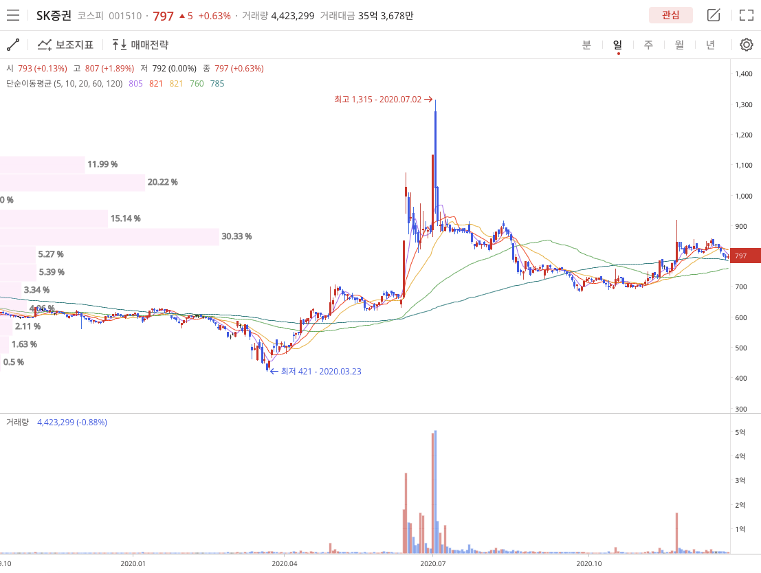 SK증권(001510)은 2020년 12월 24일 종가 797원으로 마감했으며 2020년 3월 23일 COVID-19저점 421원(52주 저점) 이후에 2020년 7월 2일 1315원(52주 고가)를 찍었습니다.