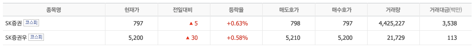 SK증권은 우선주도 있는 종목으로 우선주는 보통주보다 가격이 높은 상태로 우선주는 매매를 하지 않았습니다. 괴리율 600%이상
