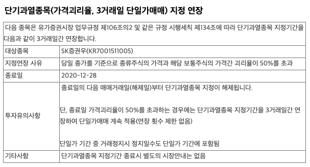 단기과열종목(가격괴리율, 3거래일 단일가 매매) 지정 연장 공시입니다.