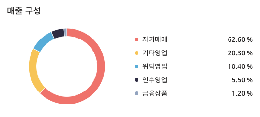SK증권(001510)의 매출 구성은 자기매매 : 62.60%, 기타영업 : 20.30%, 위탁영업 : 10.40%, 인수영업 : 5.50%, 금융상품 : 1.20% 로 구성되어 있습니다.