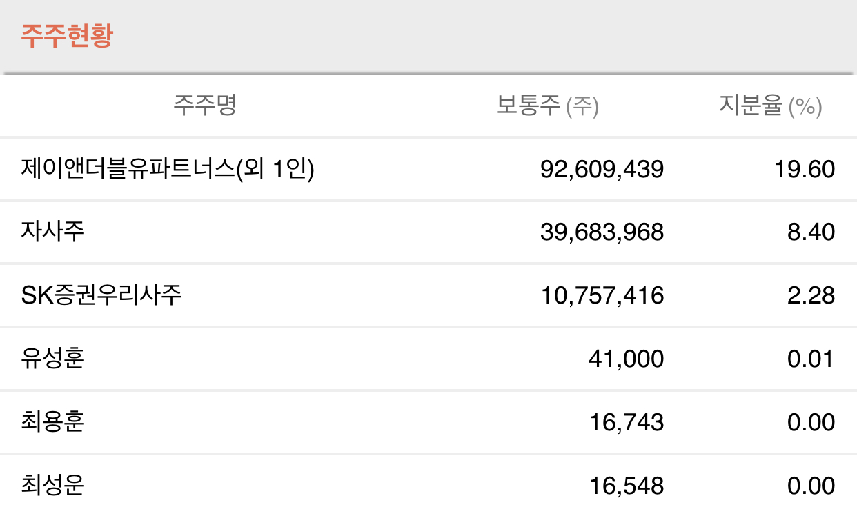 SK증권(001510)는 1955년 신우증권으로 설립, 1998년 현 상호로 변경되었음. 당분기말 동사의 최대 주주는 제이앤더블유비아이지유한회사(지분율: 19.44%)입니다.