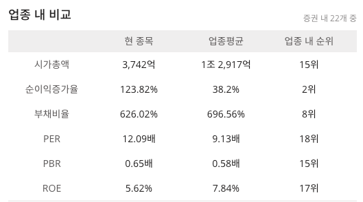 SK증권은 산업군은 금융, 세부산업군은 증권이며 외국인비중 5%정도 세부산업군 증권 업종기준으로 시가총액 15위(3,742억)이며 ROE 17위 코스피 338위 종목입니다.