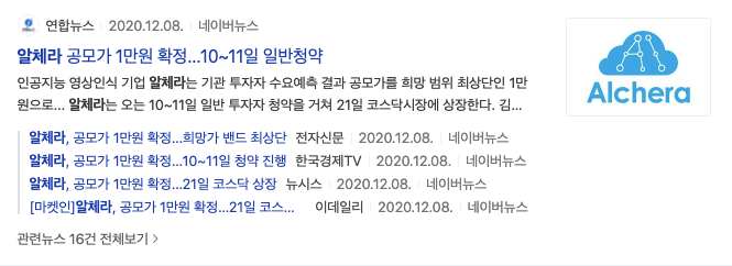 그러면 알체라(347860)는 저는 몰랐지만 2020년 12월 8일 공모가 1만원 확정 10~11일 일반청약 이라는 기사제목을 볼 수 있습니다.