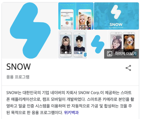 스노우가 바로 이 스노우 입니다. 보면 네이버의 자회사 SNOW Corp.이 제공하는 스마트 폰 애플리션으로, 캠프 모바일이 개발하였다. 라고 되어 있는데요 아래의 보이는 부분은 Visual AI로 생각됩니다.