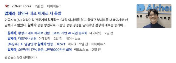 그리고 알체라 황영규 대표 체제로 새 출발이라는 기사 제목을 볼 수 있습니다. 주요주주 중 한명입니다.