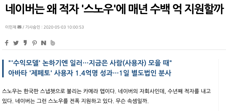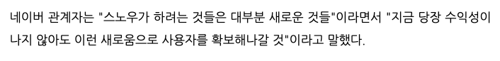네이버는 왜 적자 스노우에 매년 수백 억 지원할까 라는 기사제목안에 네이버 관계자는 스노우가 하려는 것들은 대부분 새로운 것들이라면서 지금 당장 수익성이 나지 않아도 이런 새로움으로 사용자를 확보해나갈 것이라고 말했다고 합니다.