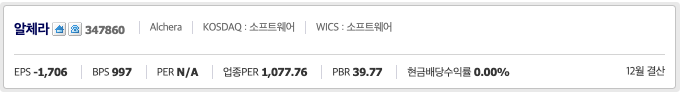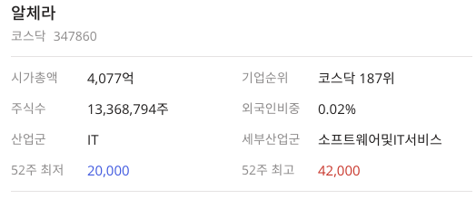 알체라(347860)은 코스닥 187위 종목으로 산업군은 IT, 세부산업군은 소프트웨어및IT서비스로 되어 있습니다.